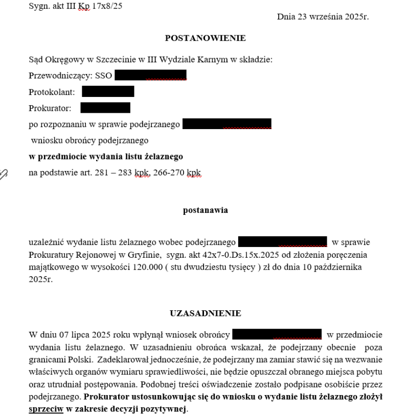 List żelazny - gwarancja odpowiadania z tzw. wolnej stopyList żelazny – Sąd Okręgowy Częstochowa uwzględnia wniosek adwokat Szczecin Krzysztof TumielewiczSąd Okręgowy w Częstochowie uwzględnił nasz wniosek o wydanie listu żelaznego dla podejrzanego który przebywa za granicą. List żelazny(...)